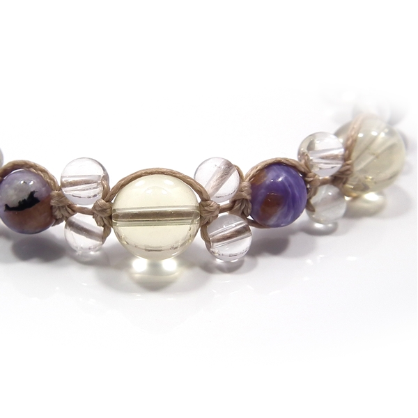 世界三大ヒーリングストーンといわれ、注目されている紫色のチャロアイトと、優しい黄色のレモンクォーツの間に、小粒の水晶とホワイトフローライトをはさんだ編み込みブレスレットです。チャロアイトは自立心を高めて積極性を引き出し、フローライトは、集中力を高める効果があるとされています。また、硫黄成分を含むレモンクォーツがこれらの石の力を刺激してくれるでしょう。物事の真贋を見極め、正しい決断をしたい時にオススメです。