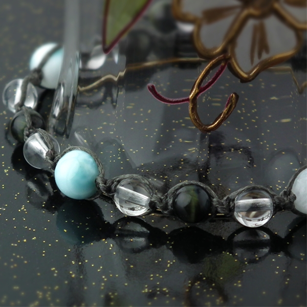 世界三大ヒーリングストーンといわれ、注目されている水色のラリマーをメインに、ブルータイガーアイと水晶を組み合わせた編み込みブレスレットです。写真では黒く見えるブルータイガーアイですが、肉眼で見ると、光の加減で青い光の筋が見えてとてもきれいです。ブルータイガーアイは、ホークスアイ(鷹目石)ともいわれ、心眼を開くのを助けるといわれています。ラリマーは、広い心と落ち着きをもたらすといわれています。何だか最近停滞してるな、もっと視野を広げて成長したいな、という方にオススメです。