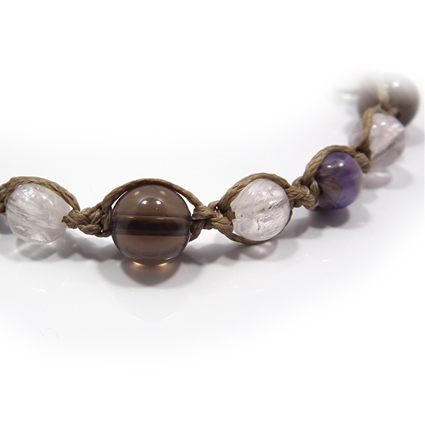 スモーキークォーツをメインに配置し、クンツァイトと、世界三大ヒーリングストーンといわれ、注目されている紫色のチャロアイトを組み合わせた編み込みブレスレットです。精神安定作用をもつといわれるスモーキークォーツと、自立心を高めるとされるチャロアイト、過去の傷を癒すといわれるクンツァイト。人生の転機に直面し深い傷を負った方、次の道への道しるべが欲しいと思われている方などにオススメです。