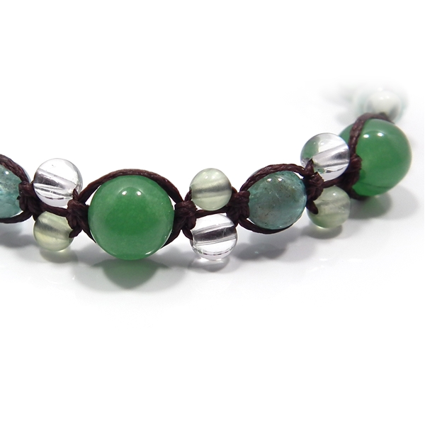 8ミリのアベンチュリンと6ミリのアパタイトに、小粒のプレナイトと水晶を組み合わせた編み込みブレスレットです。アベンチュリンとプレナイトの緑色に少し青みがかった緑のアパタイト。爽やかな色合いです。アベンチュリンは精神を安定させ、アパタイトは自己表現を助け、プレナイトは思考を明晰にして直感力を高めてくれるとされます。人とのコミュニケーションを円滑にしたい方、仕事運を上げたい方にオススメです。