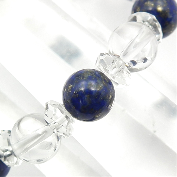 ラピスラズリと水晶に、ボタンカット水晶を組み合わせたブレスレットです。クリアな水晶ときらきら光るカット水晶に、ダークな紺色に宇宙を感じさせる内包物を含むラピスラズリがアクセントになって、素敵なブレスレットに仕上がりました。