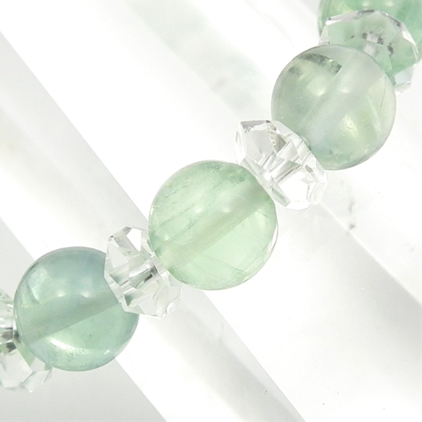 グリーンフローライトに、ボタンカット水晶を組み合わせたブレスレットです。透明感のあるさわやかな緑色のフローライトに、カット水晶がきらきら光ります。