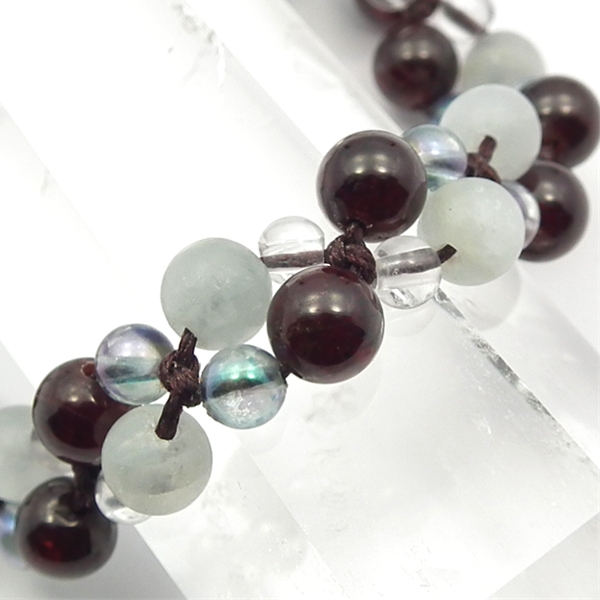 ガーネットとセレスタイトに、小粒な水晶を加えた編み込みブレスレットです。ガーネットの重厚感を、セレスタイトの淡い色合いが中和して、上品で落ち着いた仕上がりになりました。ガーネットは思いや努力を実らせ、成功へと導く、セレスタイトは思いやりを育み、人間関係に愛と調和を運ぶといわれています。