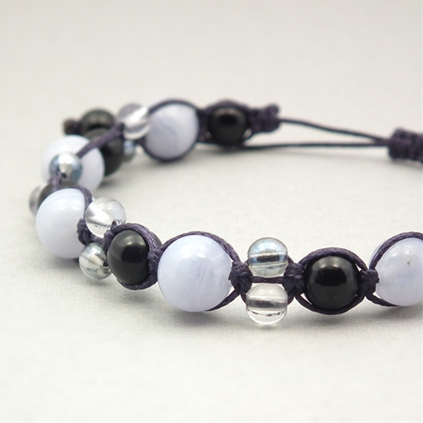 8ミリのブルーレースアゲートと6ミリのオニキスに、小粒なオーラクォーツと水晶を組み合わせた、編み込みブレスレットです。ブルーレースアゲートは、緊張を緩和し、リラックス状態に導く、オニキスは精神を安定させるといわれています。リラックスしたいと方にオススメです。