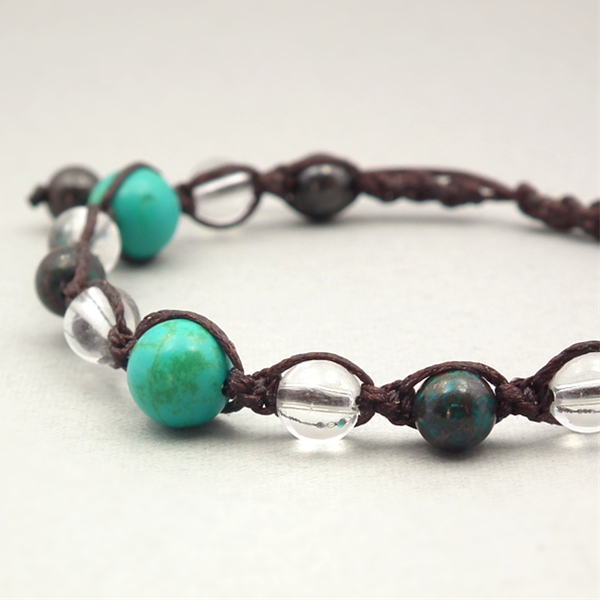 8ミリ玉のターコイズをメインに、クリソコラと水晶を組み合わせた編み込みブレスレットです。ターコイズは積極的に行動する勇気をもたらす、クリソコラは人間関係を円滑にする、といわれています。積極的なコミュニケーション力をアップしたい方にオススメです。