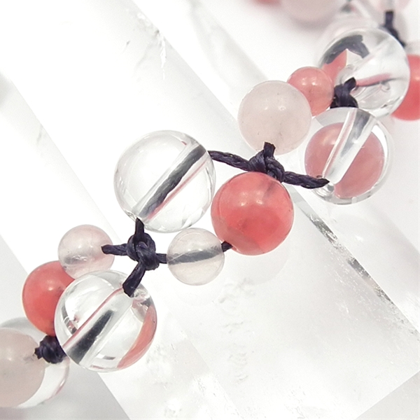 インカローズとローズクォーツに、8ミリの水晶を組み合わせた編み込みブレスレットです。透明感のあるサーモンピンクのインカローズを、やわらかいピンク色のローズクォーツと透明な水晶が引き立て、とても可愛らしく綺麗な仕上がりになりました。愛を引き寄せるといわれるローズクォーツ、出会いと恋、勇気をもたらすといわれるインカローズの恋愛運最強の組み合わせが、素敵な出会いをもたらしてくれそうです。