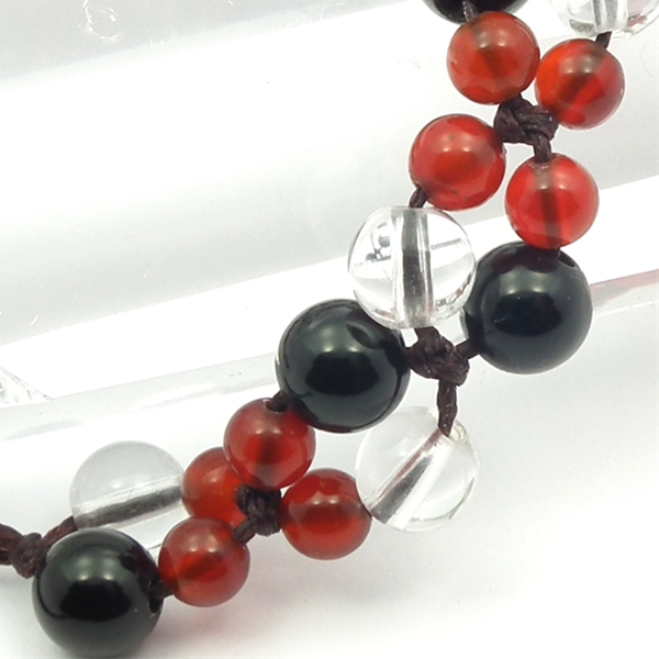 オニキスと水晶に、小粒なレッドアゲートを組み合わせた編込みブレスレットです。深みのある赤い小粒なレッドアゲートが黒いオニキスと絶妙に組み合わさって素敵な落ち着きを感じさせてくれます。オニキスとレッドアゲートは、どちらも瑪瑙の仲間です。瑪瑙は、健康・長寿・子宝をもたらすといわれています。