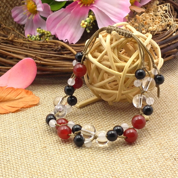 8ミリ玉の水晶とレッドアゲートに、6ミリのなオニキスと小粒なホワイトアゲートを組み合わせた編み込みブレスレットです。大ぶりな水晶とレッドアゲートがボリューム感をアップしています。アゲート(瑪瑙)は古くからお守りとして珍重されてきました。オニキスもアゲートの仲間で、魔除け効果に優れているといわれています。