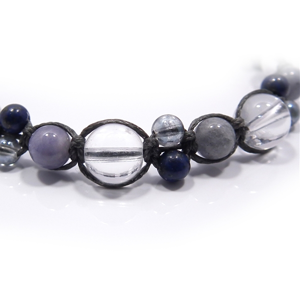 オーラクォーツとタンザナイトに、小粒なラピスラズリと水晶を組み合わせた編み込みブレスレットです。