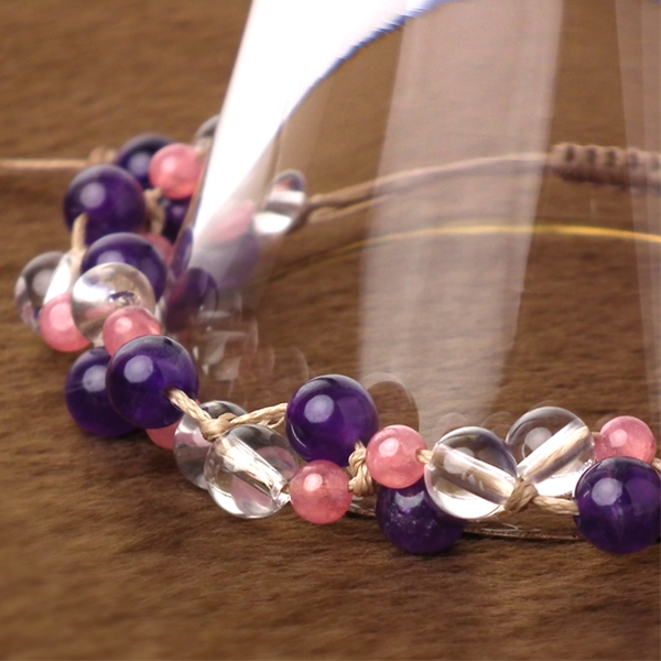 アメジストと水晶に、小粒なインカローズを組み合わせた、編み込みブレスレットです。アメジストの濃い紫と、透明感のあるインカローズのピンクがとてもマッチしています。アメジストは愛の守護石とされ、真実の愛を守り抜く力を育む、インカローズは持つ人に出会いと恋をもたらす、といわれています。恋愛運アップのお守りにオススメです。