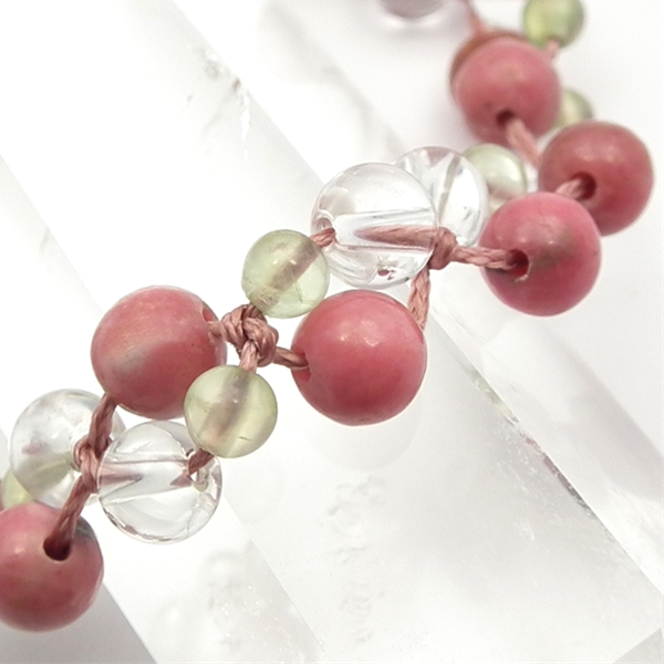 ロードナイトと水晶に、小粒なプレナイトを組み合わせた、編み込みブレスレットです。薔薇色のロードナイトに、さわやかなプレナイトの透明感のあるグリーンが優しい色合いに仕上がりました。ロードナイトは情緒のバランスを整える、プレナイトは思考を明晰にして直感力、判断力を高めるといわれています。忙しい人や、判断力が鈍い人にオススメのお守りです。