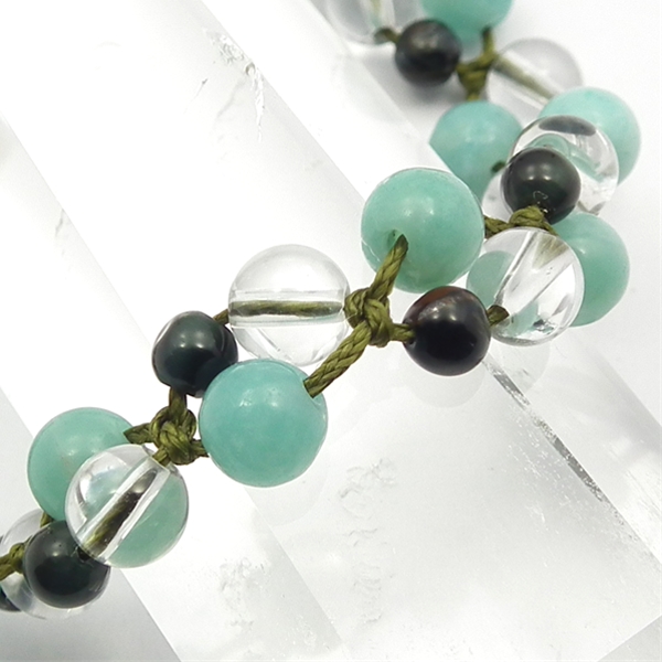 アマゾナイトと水晶に、小粒なブルータイガーアイを組み合わせた、編み込みブレスレットです。アマゾナイトは合理的な思考を促す、タイガーアイは視野を広げ、洞察力を養い、正しい決断へと導くといわれています。客観的な視点で物事を見極めたい方のお守りとしてオススメです。