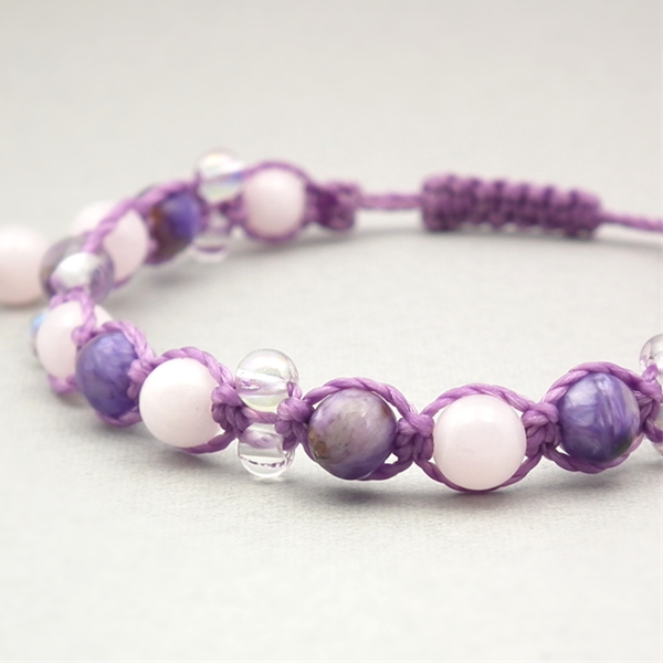 チャロアイトとピンクカルサイトに、小粒な水晶を組み合わせた、編み込みブレスレットです。チャロアイトは自立心を高め、勇気を持った次の行動へ促す、ピンクカルサイトは恋愛に関するマイナスな気持ちやトラウマを、ポジティブな気持ちに変換してくれるといわれています。