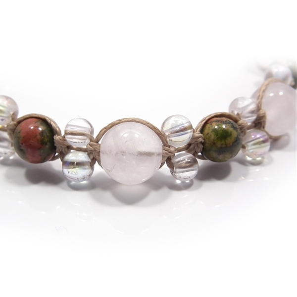 ユナカイトと、ローズクォーツの間に、小粒の水晶をはさんだ編み込みブレスレットです。深い緑にピンク色が混ざったユナカイトと淡い色合いのローズクォーツの間に入ったオーラ系のクォーツが、双方をうまく引き立たせてくれて、上品で素敵な感じに仕上がりました。ユナカイトは、トラウマや恐怖心を取り去るといわれ、ローズクォーツは愛と癒しのエネルギーに溢れ、過去の心の傷やトラウマを癒すといわれています。過去のトラウマなどにお悩みの方にオススメです。