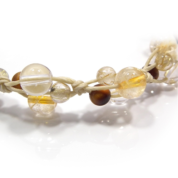 紐の種類が変わりました!小粒なタイガーアイとルチルクォーツに、シトリンと水晶を組み合わせた、編み込みブレスレットです。シトリンは商売の繁栄と富をもたらす、タイガーアイは仕事運や金運を高める、ルチルクォーツは「金銭を呼び込む石」として、それぞれ金運アップのお守りとして有名です。全体的に黄色の色合いがいかにも金運を上げてくれそうな感じです♪