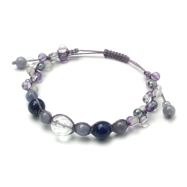 10ミリのカットクォーツを中心に、8ミリのラピスラズリ、6ミリのタンザナイト、小粒な水晶とラベンダーアメジストを組み合わせた編み込みブレスレットです。
