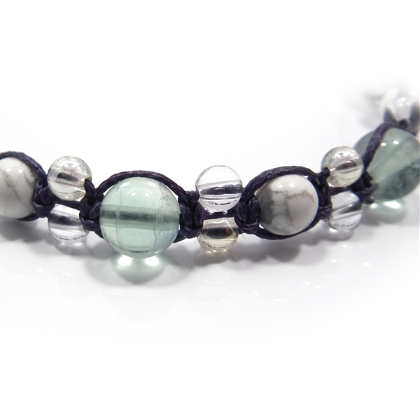 ハウライトと、グリーンフローライトの間に、小粒の水晶をはさんだ編み込みブレスレットです。白のハウライトと、淡い透明感のあるグリーンフローライトの間にきらきら光るオーラ系クォーツが入り、落ち着いた色合いに仕上がりました。ハウライトは柔軟な浄化作用、フローライトは集中力を高め、精神を安定させるといわれています。集中力や直感力をアップして勉強したい時のお守りにオススメです。