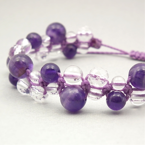 8ミリと6ミリのアメジストに、カット水晶と普通の水晶を組み合わせた、編み込みブレスレットです。不ぞろいなサイズの石の組合せが、ボリューム感を与えてくれます。