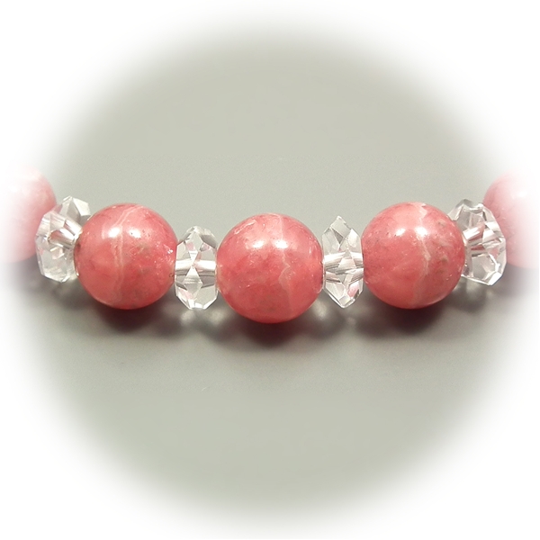 インカローズに、ボタンカット水晶を組み合わせたブレスレットです。縞のあるサーモンピンクのインカローズに、カット水晶がきらきら光ります。