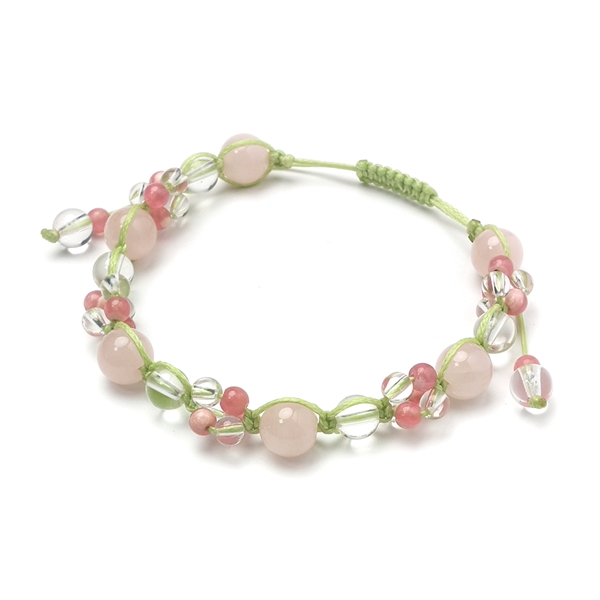 8ミリのローズクォーツと、小粒な4ミリのインカローズと、水晶を組み合わせた編み込みブレスレットです。水晶とインカローズのつぶつぶ感が何ともかわいらしいです。全体的にピンク色なので、見ていると乙女チックな気分になり、なんとなく心がうきうきしてきます。恋愛運最強の組み合わせです。どちらの石もかわいらしいピンク色で、初々しい、恋する女性にふさわしい魅力を育ててくれるでしょう。