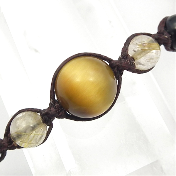 10ミリのゴールデンタイガーアイを中心に配置し、その両脇にルチルクォーツ、そして8ミリのシトリンと6ミリのブルータイガーアイ、水晶を組み合わせた編み込みブレスレットです。タイガーアイは仕事運や金運を高める、シトリンは商売の繁栄と富をもたらす、ルチルクォーツは「金銭を呼び込む石」として、それぞれ金運アップのお守りとして有名です。更に、ゴールデンタイガーアイは、特に金運アップに有効とされています。ブルータイガーアイを使用して、格好よく着けられるようにデザインしました。仕事運アップのお守りとしてもどうぞ!