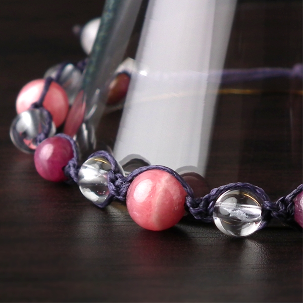 インカローズをメインに、宝石としても有名なルビーと水晶を組み合わせた編み込みブレスレットです。縞があって、少し透明度のあるサーモンピンクのインカローズと、重厚な赤い輝きを放つルビーがとても魅力的です。どちらの石も勇気と自信を高め、女性の魅力をアップしてくれるといわれています。自身の魅力をアップし、勇気を持って情熱的な恋愛がしたい方にオススメです。