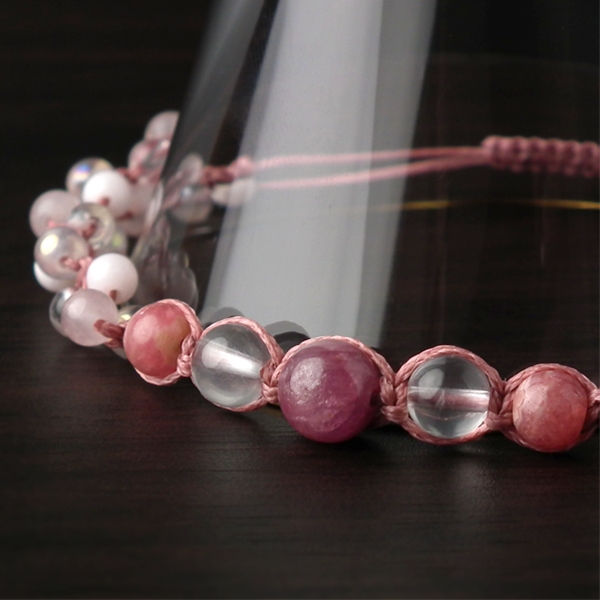 宝石としても有名なルビーを中心に配置し、インカローズ、小粒のピンクカルサイトとローズクォーツ、水晶を組み合わせた、編み込みブレスレットです。全体的にピンク色でまとめたため、非常に可愛らしく優しい仕上がりになりました。小粒なオーラ系水晶が組み合わせてあるので、光の加減で少しきらきらしています。優しいピンク色で魅力アップ!