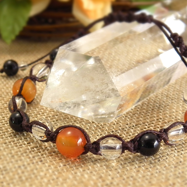 カーネリアンをメインに配置し、オニキスと水晶を組み合わせた編み込みブレスレットです。カーネリアンは活力の回復にもすぐれた作用があるといわれ、オニキスは新陳代謝を活発にし、健康や長寿をもたらすといわれています。集中力の強化や疲労回復にオススメです。