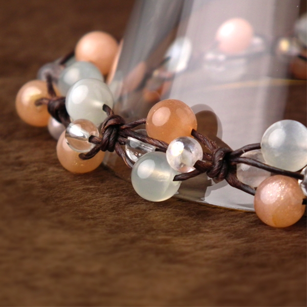 小粒なローズオーラと水晶に、シルバームーンストーンと、サンストーンとムーンストーンの両方の性質を備えたサンムーンストーンを組み合わせた編み込みブレスレットです。当店一番人気のムーンストーンとラブラドライトのブレスレットに勝るとも劣らない、ムーンストーンの好きな人にはオススメの逸品です!
