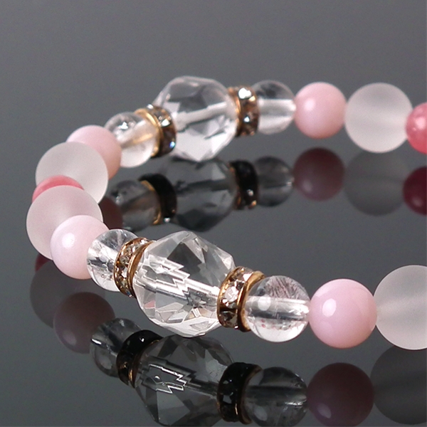 6ミリのピンクオパールとインカローズ、8ミリのフロスト水晶と6ミリのクラック水晶、10ミリのスターカット水晶とロンデルを組み合わせたブレスレットです。全体的な淡い色合いに、インカローズのサーモンピンクがアクセントになって、女性らしく可愛い仕上がりになりました。ピンクオパールは持つ人の魅力を引き出す、インカローズは出会いと恋をもたらす、といわれています。恋愛がしたい!人にオススメです。