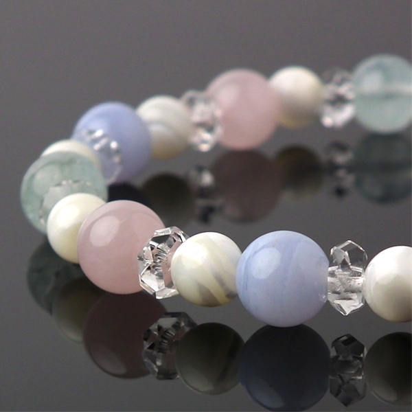 8ミリのブルーレースアゲートとアクアマリン、ローズクォーツに、マザーオブパールとボタンカット水晶を組み合わせたブレスレットです。全体的にパステルカラーでまとまって、やさしい感じのブレスレットに仕上がりました。使用しているすべての石は、癒し効果があるといわれていて、ローズクォーツとアクアマリンは恋愛に関連する石として知られています。やさしい色合いに癒されてください♪