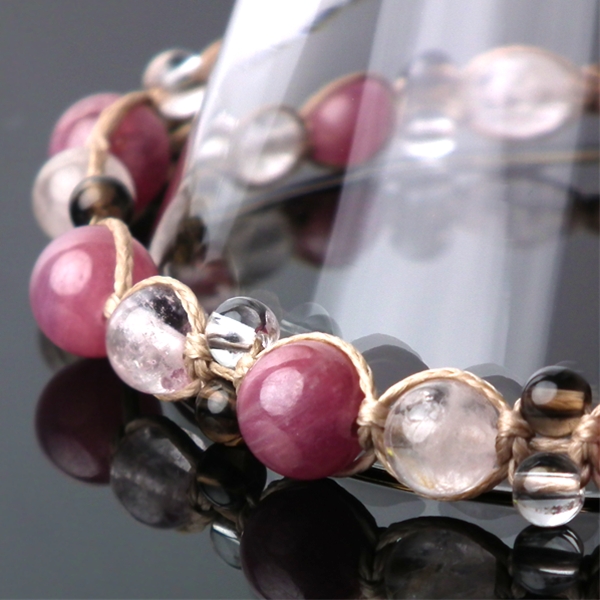 ルビーとモルガナイトに、小粒なスモーキークォーツと水晶を組み合わせた編み込みブレスレットです。存在感のある希少石ルビーを贅沢に使用しました。モルガナイトのピンク色がその存在感を和らげ、スモーキークォーツの透明感のある茶色がちょっとしたアクセントになっています。ルビーとモルガナイトの愛のパワーで女性の魅力アップ♪