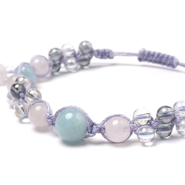 アクアマリンをメインに配置し、ローズクォーツ、小粒のオーラクォーツを組み合わせた、編み込みブレスレットです。アクアマリンの水色とローズクォーツのピンク色の組み合わせがとても優しい雰囲気になっています。