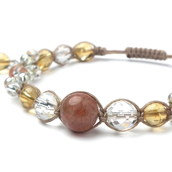 10ミリのサンストーンの両脇にカットクォーツを配置し、6ミリのマイカサンストーンとシトリン、小粒な水晶とオーラクォーツを組み合わせた編み込みブレスレットです。サンストーンとシトリンの太陽のような暖かさと輝きに、水晶の透明感とオーラクォーツの光が加わってキラキラした印象に仕上がりました。