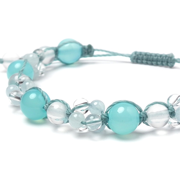 8ミリのシーブルーカルセドニーと、小粒な4ミリのアクアマリンと、水晶を組み合わせた編み込みブレスレットです。水晶とアクアマリンのつぶつぶ感が何ともかわいらしいです。全体的に水色の色なので、見ていると気持ちが洗われ、穏やかな気持ちになってくるような気がします。どちらの石も対人関係に良いとされている石です。やさしい水色の石の波動が、ささくれがちな気持ちを静め、穏やかで優しい気持ちで人に接する助けになってくれることでしょう。