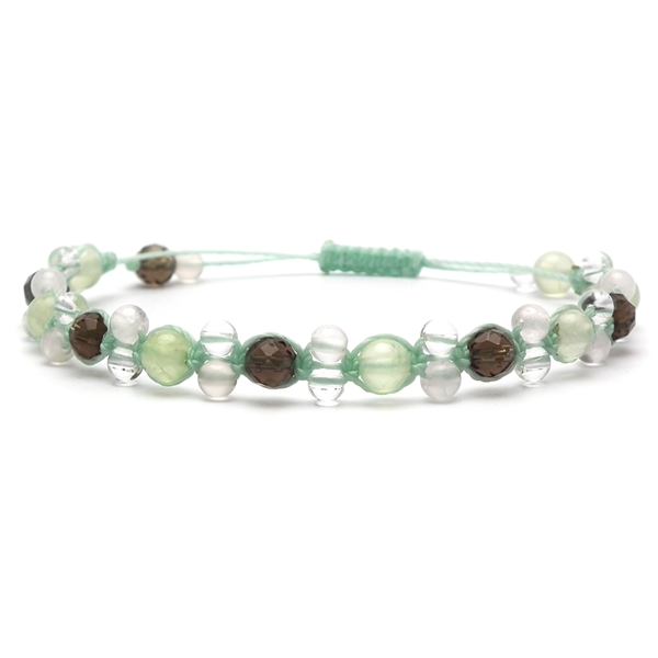 プレナイトとカットスモーキークォーツに、小粒なローズクォーツと水晶を組み合わせた編み込みブレスレットです。全体的に淡い色合いに、光の加減で光るカットスモーキークォーツがアクセントになっています。