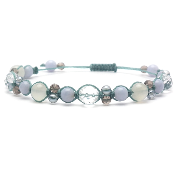 シルバームーンストーンとカット水晶、ブルーレースアゲートに、小粒なカットスモーキークォーツとオーラクォーツを組み合わせた編み込みブレスレットです。淡いブルー系の色合いが爽やかなブレスレットです。