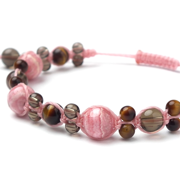 インカローズと、スモーキークォーツ、タイガーアイの間に、小粒なスモーキークォーツとタイガーアイをはさんだ編み込みブレスレットです。淡いピンク色のインカローズとダークな色合いのスモーキークォーツとタイガーアイが絶妙なバランスです。紐の色とマッチしてとても可愛らしく仕上がりました。